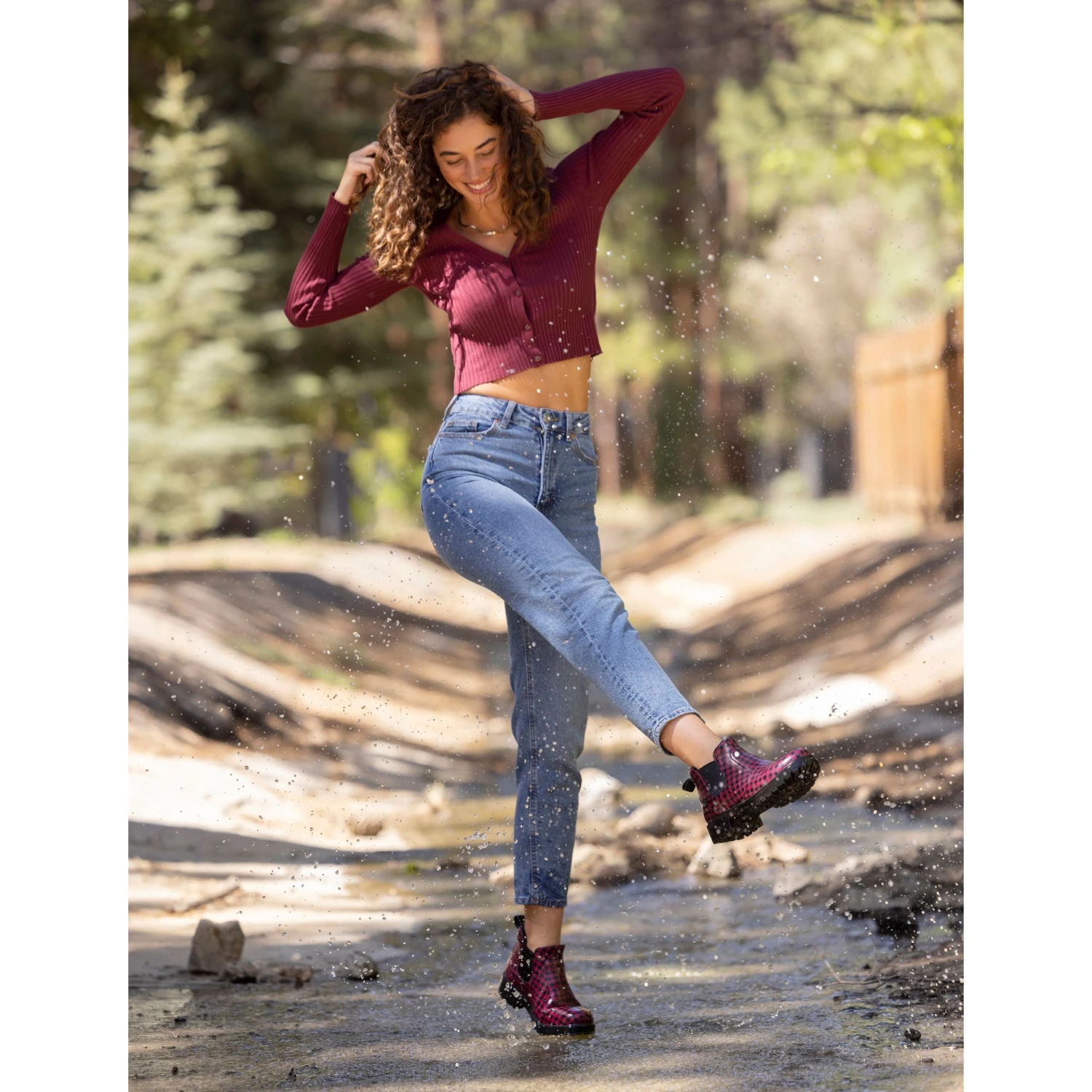 Featured in a Gingham colorway on a vegan leather upper.