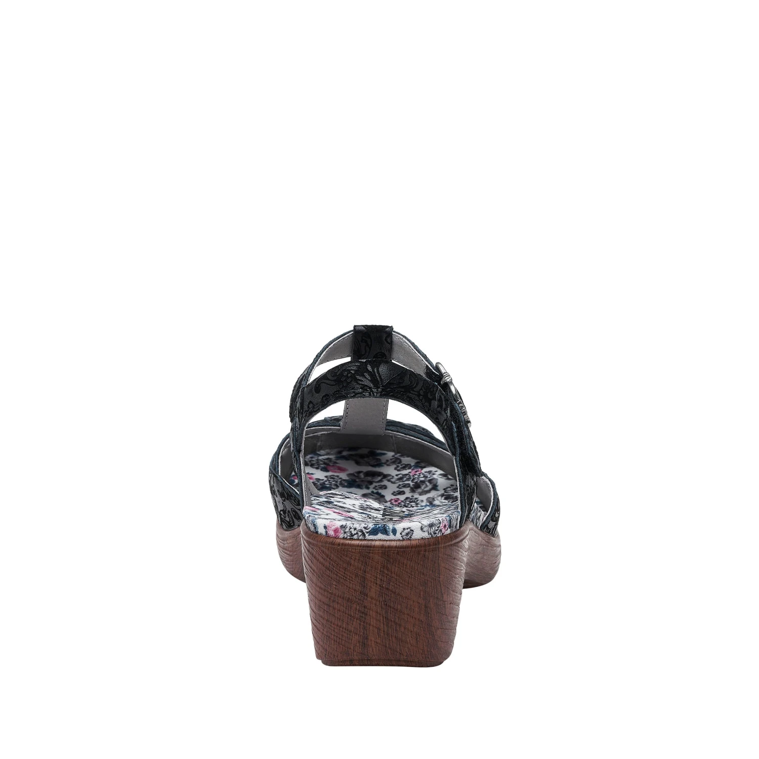 The Summer is a T-strap leather sandal with an adjustable hook-and-loop strap, with given added flair from open sides for an easy breezy look and feel. The wedge gives added height without adding pressure on the balls of the feet, and a slip-resistant lightweight wood look wedge that goes from day to night. The colorful print on the exposed, durable, micro suede wrapped footbed adds a playful eye-catching detail, and provides enhanced arch support for all day comfort.